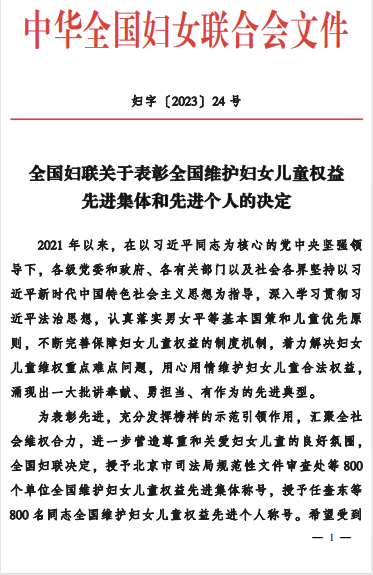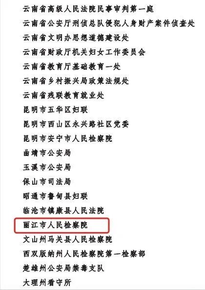 日前,全国妇联印发《全国妇联关于表彰全国维护妇女儿童权益先进集体和先进个人的决定》,丽江市人民检察院被授予“全国维护妇女儿童权益先进集体”称号。