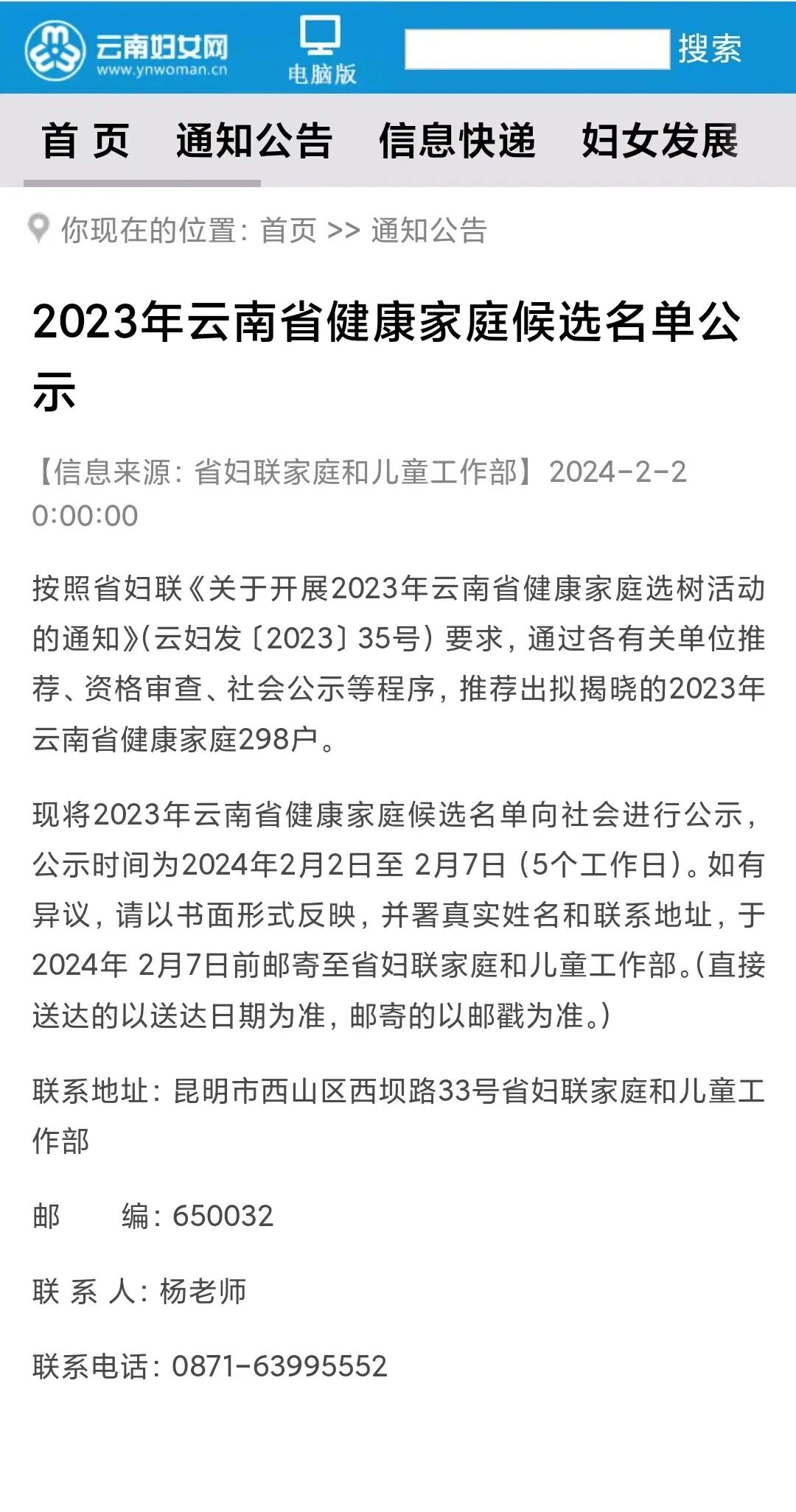 近日,云南省妇女联合会发布了《2023年云南省健康家庭候选名单公示》,其中,来自丽江市人民检察院的韩静家庭入选。