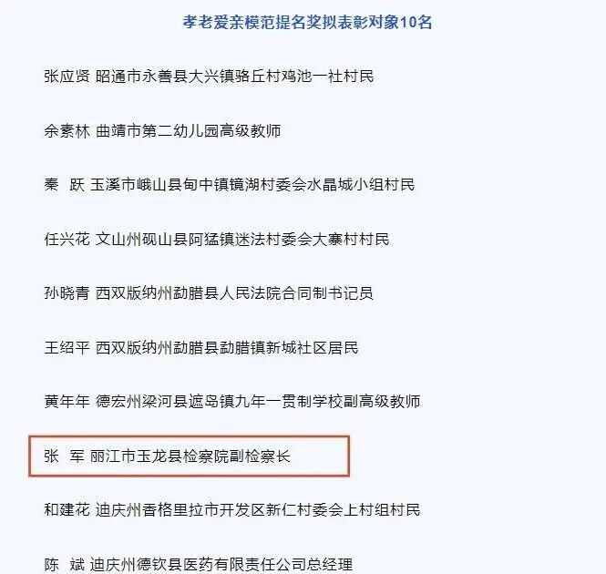 6月21日,中共云南省委宣传部、云南省人力资源和社会保障厅发布《关于2023年云南省道德模范及提名奖拟表彰对象的公示》,其中玉龙县人民检察院党组成员、副检察长张军获评“孝老爱亲模范提名奖拟表彰对象”。
