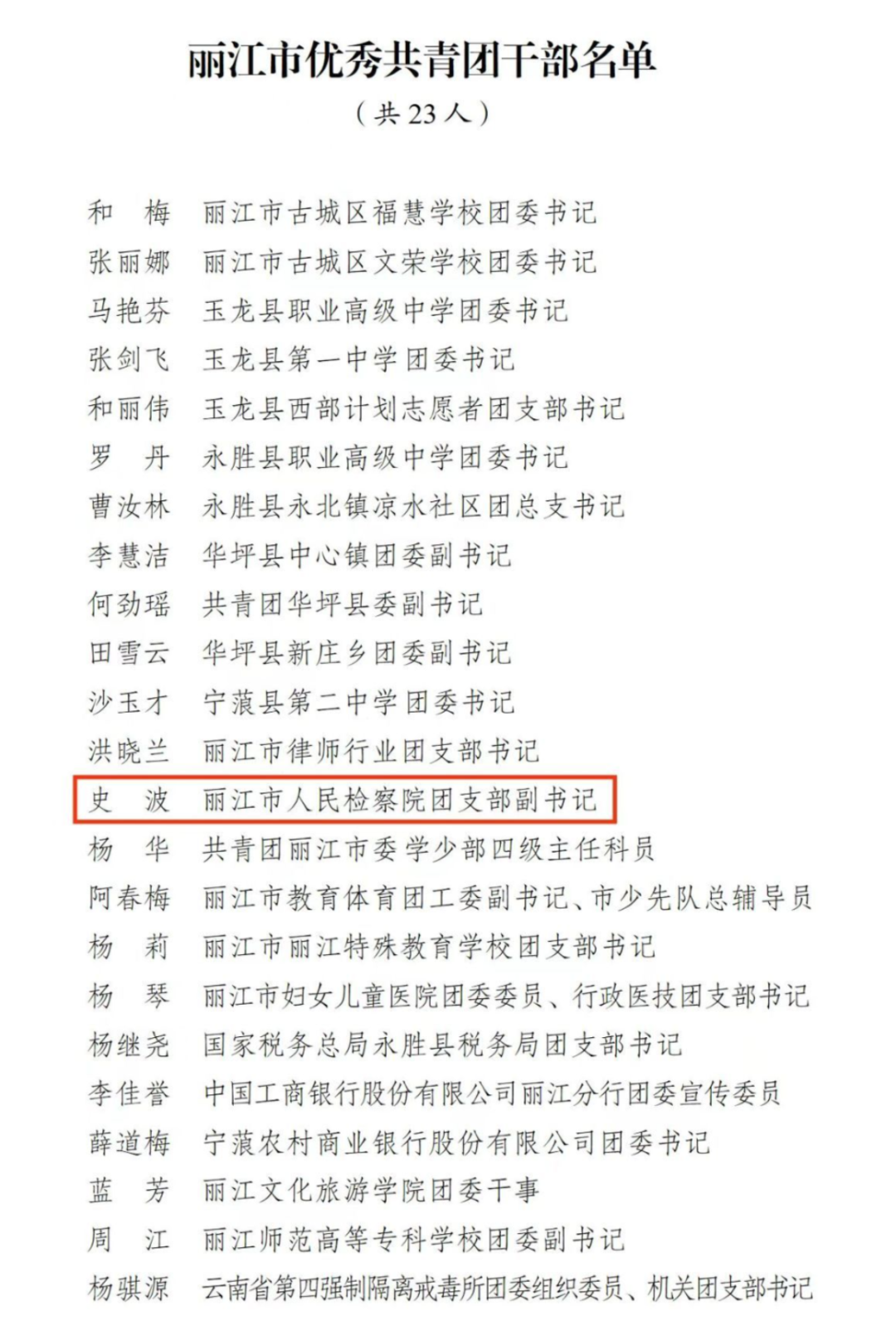近日,共青团丽江市委发布了全市“两红两优”名单,丽江市人民检察院史波同志获评“丽江市优秀共青团干部”称号。共青团是党联系青年群众的桥梁纽带。一直以来,我院坚持“党建带团建”,加强团支部组织建设,着力强化团员青年思想政治建设,努力在思想引领中展现青春活力。史波同志自担任我院团支部副书记以来,深入贯彻习近平总书记关于青年工作的重要思想,加强团员日常教育和培养,充分发挥团支部桥梁纽带作用,紧跟党建发展步伐,做好各项青年工作,进一步引导青年干警坚定理想信念、练就过硬本领,激励引领广大青年干警忠诚履职、为民服务、担当作为。