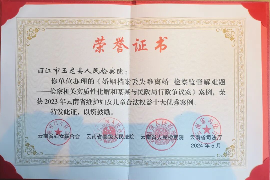 7月5日,“2023年云南省维护妇女儿童合法权益十大优秀案例”揭晓活动在昆明举行,揭晓名单中,玉龙县人民检察院办理的《婚姻档案丢失难离婚 检察监督解难题——检察机关实质性化解和某某与民政局行政争议案》荣获 2023年云南省维护妇女儿童合法权益十大优秀案例 。