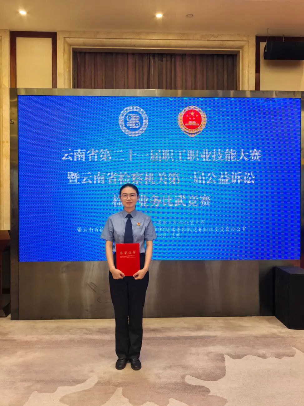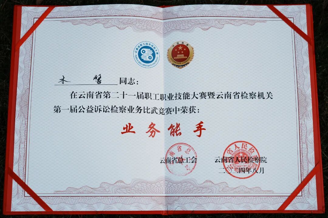 8月27日至29日,由云南省总工会和云南省人民检察院共同组织的云南省第二十一届职工职业技能大赛暨云南省检察机关第一届公益诉讼检察业务比武竞赛在国家检察官学院云南分院举行,共有来自全省检察机关56名选手参加竞赛,经过案例分析和文书制作、案件汇报与业务答辩、模拟法庭辩论三轮激烈的角逐,20名选手脱颖而出,其中,来自古城区人民检察院的木馨取得全省第十的好成绩,同时荣获“云南省公益诉讼检察技术能手”和“云南省公益诉讼检察业务能手”,列入全省检察机关公益诉讼检察人才库。