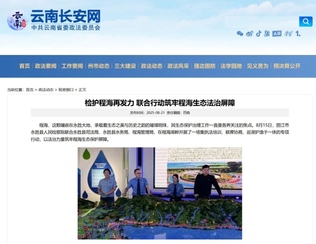 我们聚焦程海保护等生态重点,运用“河(湖)长+检察长”协作机制,联合多部门开展联席协商、巡湖护渔,依托“智慧程海”综合管理服务平台,动态监测湖体水质等关键数据,以公益诉讼检察守护绿水青山,为永胜的“绿美”蓝图增添检察底色。