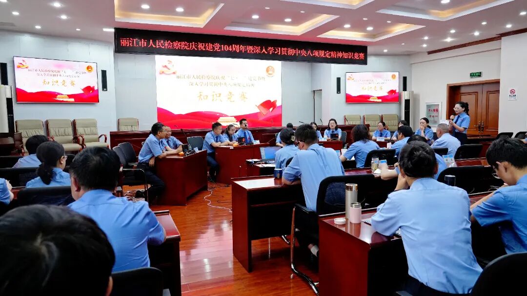 为热烈庆祝中国共产党成立104周年,推动深入贯彻中央八项规定精神学习教育走深走实,持续激发全院干警知史爱党、知史爱国的学习热情,7月16日上午,丽江市检察院举办深入学习贯彻中央八项规定精神知识竞赛。
