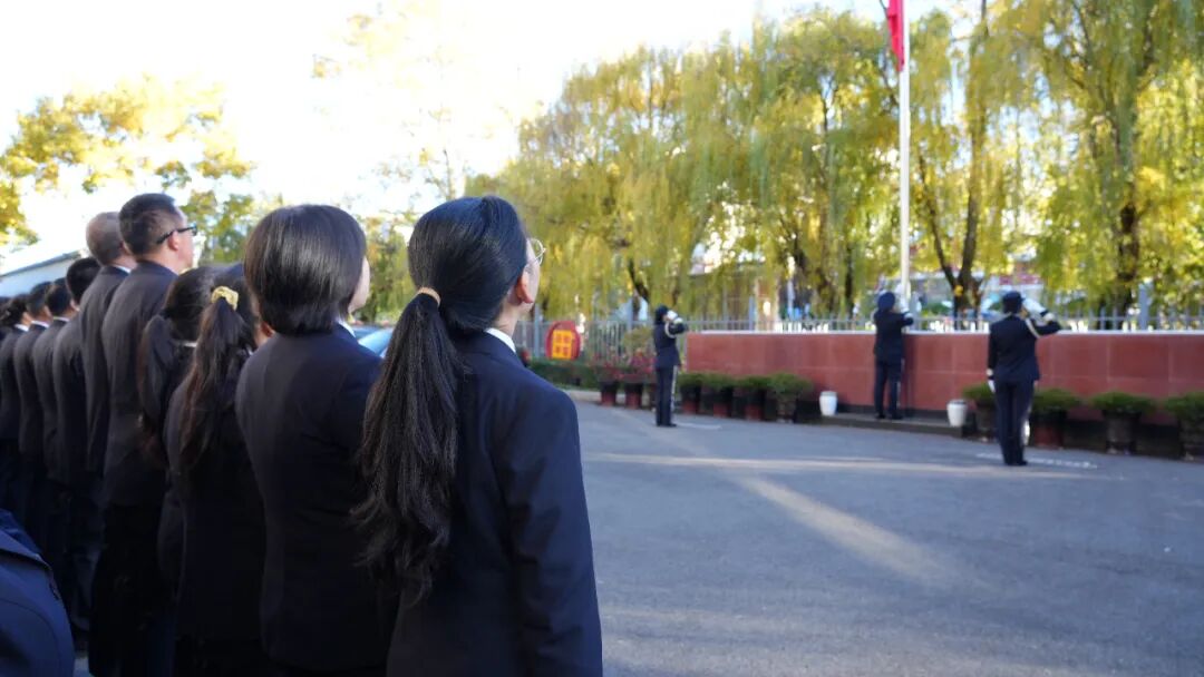 上午9时,升旗仪式正式开始。全体干警整齐列队,面向国旗肃立。在雄壮的国歌声中,鲜艳的五星红旗冉冉升起,全体人员行注目礼,表达对祖国的无限忠诚和崇高敬意。