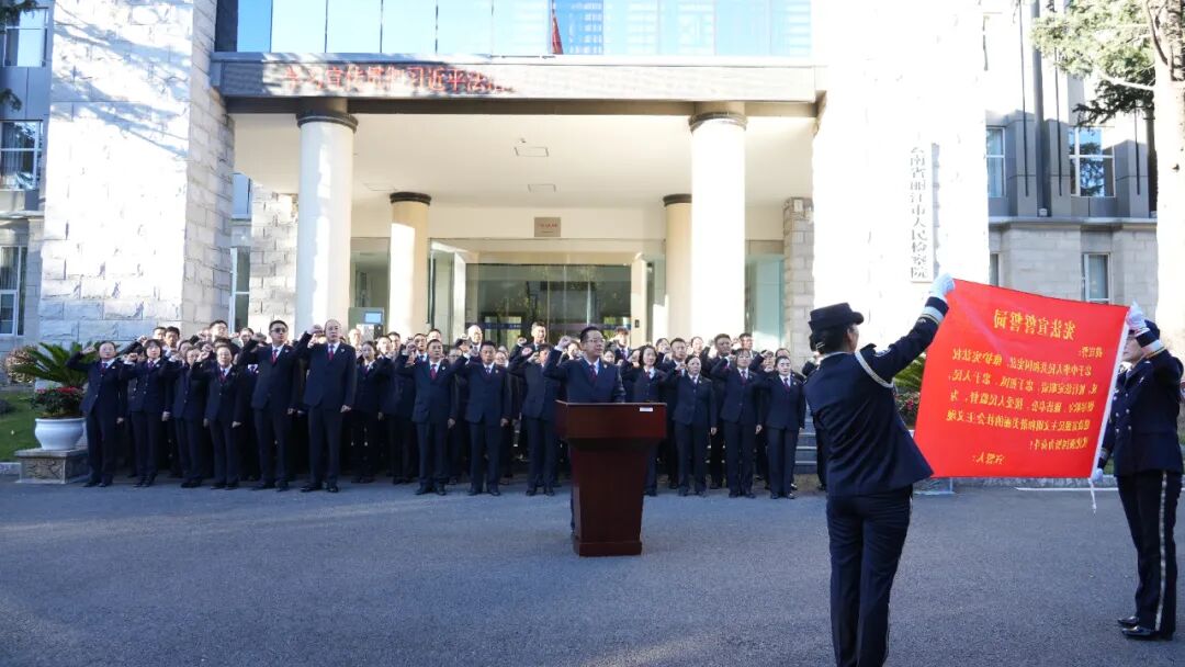 全体干警高举右拳,面向国旗和宪法庄严宣誓。