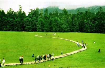 云杉坪又名锦绣谷,它是一块隐藏在原始杉林中的巨大草坪。位于玉龙雪山东麓的山箐里,在雪山主峰的右下方。